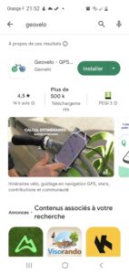 En premier lieu, il vous faut installer l’application mobile, pour cela ouvrez le play store et faite une recherche de geovelo.