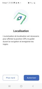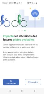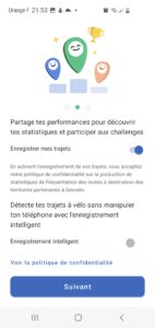 L’écran suivant vous permet de choisir si vous souhaitez enregistrer vos trajets. Cela est nécessaire pour participer au challenge. Cela permet également à Geovelo de remonter (de façon anonyme) aux collectivités les routes utilisées par les cyclistes, afin que celles-ci puissent améliorer les aménagements cyclistes. Vous pouvez également activer (ou non) l’enregistrement intelligent, qui permet de détecter automatiquement lorsque vous êtes en vélo (en cas d’oubli de démarrage de l’appli lors de vos trajets).