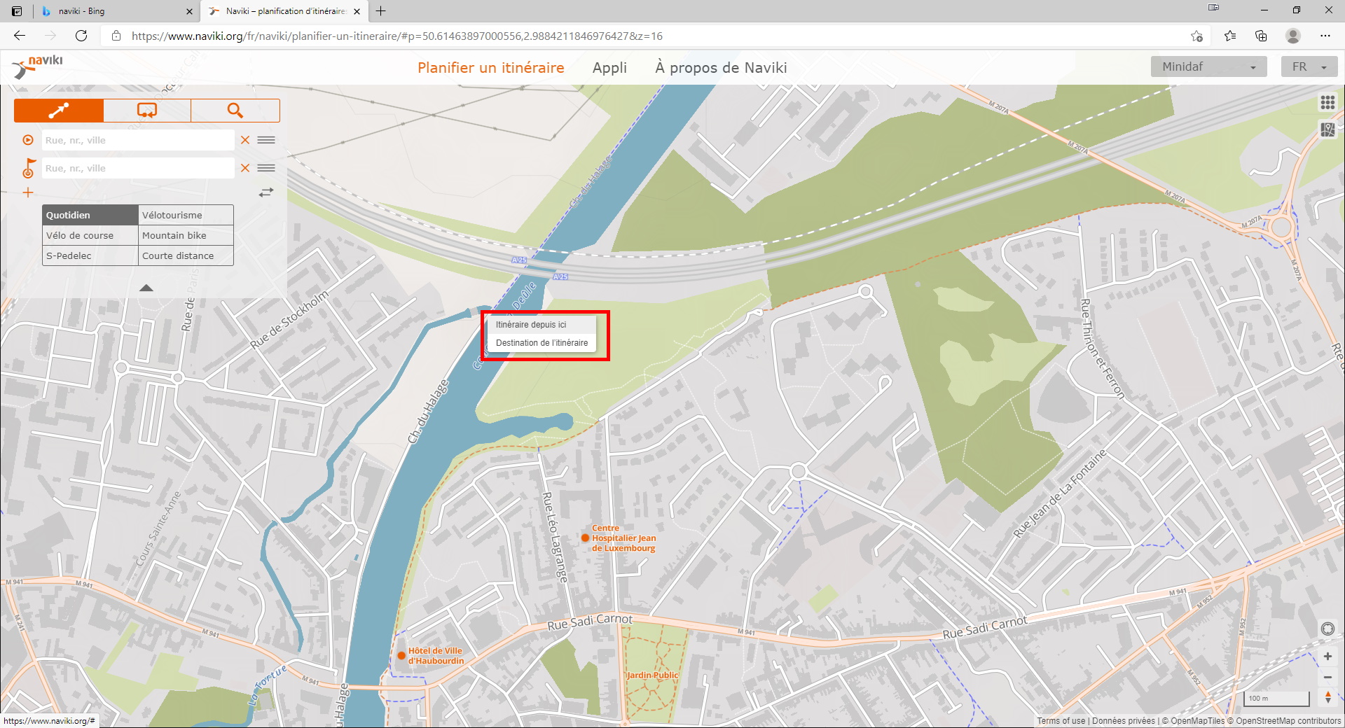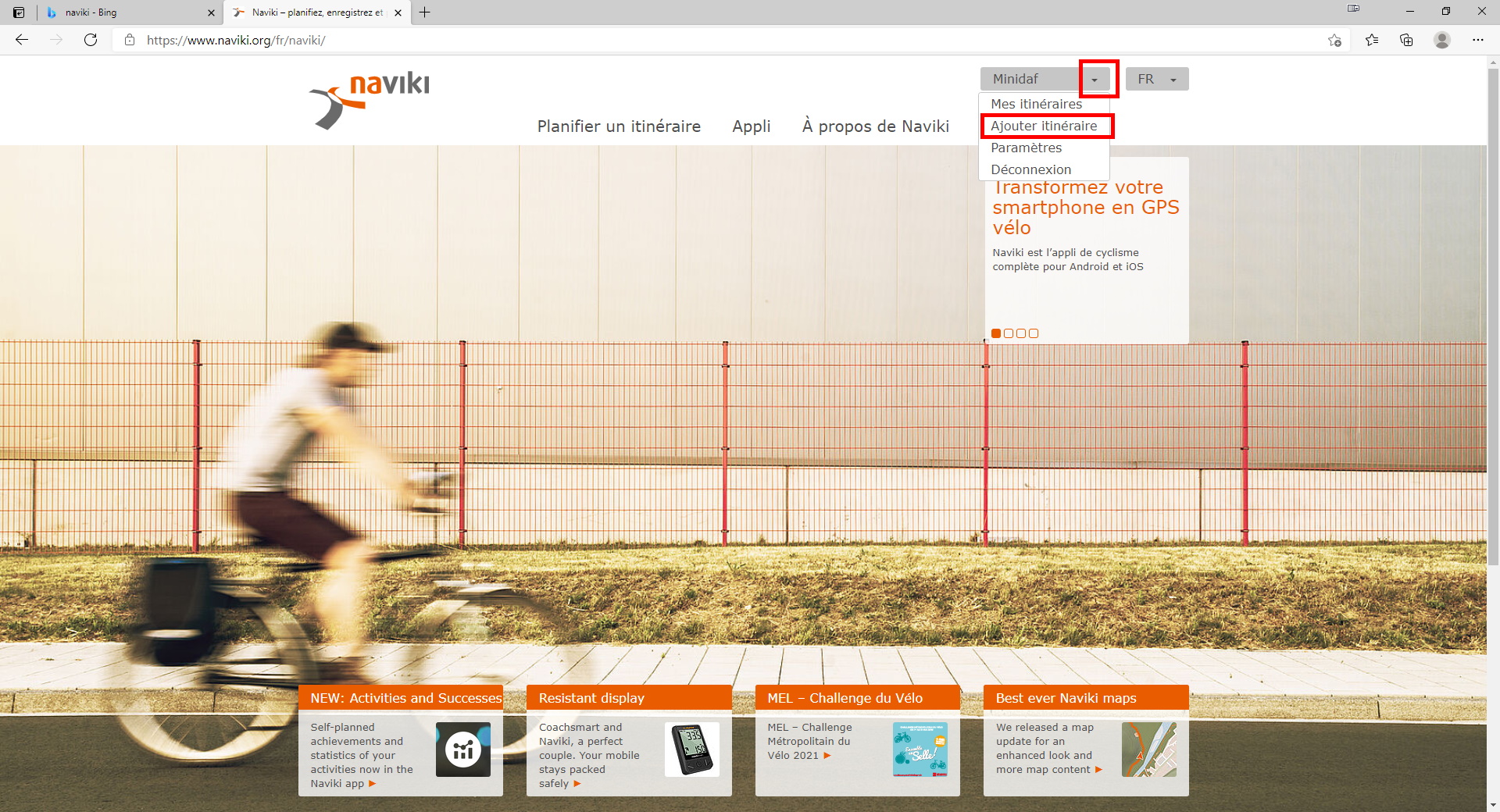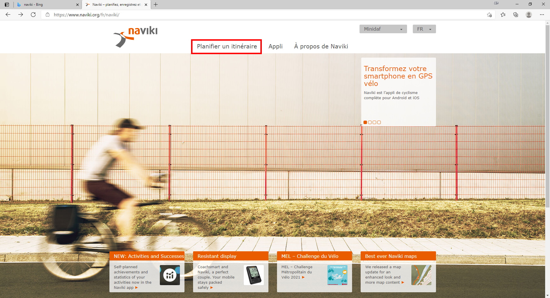 Un fois connecté sur le site Naviki, cliquez sur le menu « Planifier un itinéraire ».