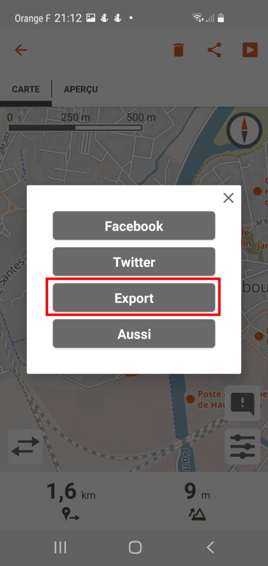 Vous pouvez alors enregistrer cet itinéraire (il ne sera pas compté pour le challenge, pour cela, voir la section Enregistrer un itinéraire pour qu’il soit comptabilisé pour le challenge)  ou l’exporter (voir la section Télécharger un itinéraire / Depuis l’application).