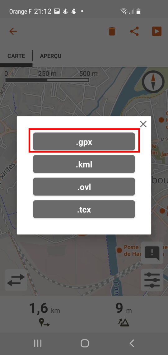 Une fenêtre s’ouvre pour choisir le format de fichier, cliquez sur .gpx.