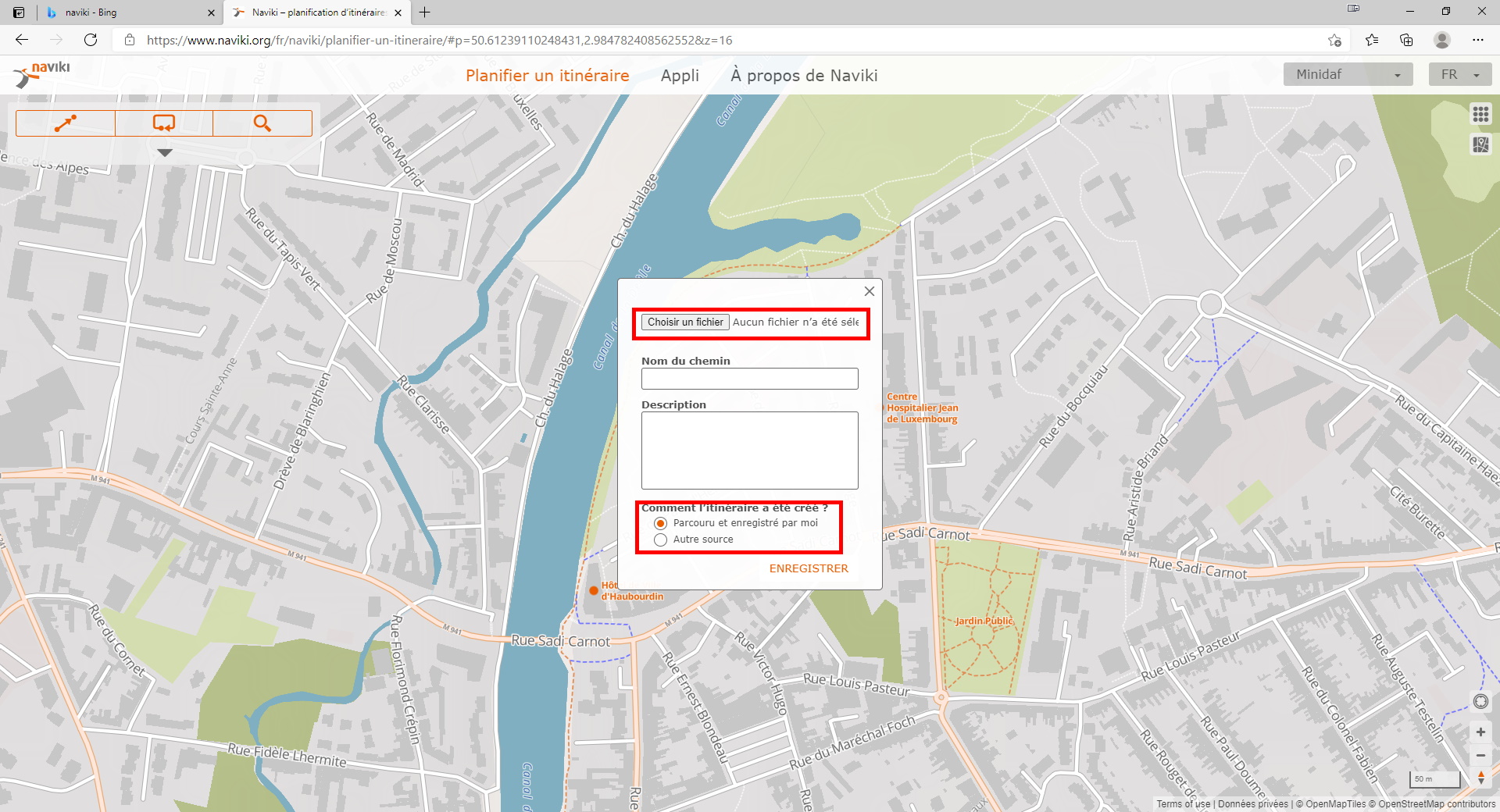 Sélectionnez alors votre fichier .gpx précédemment créé, vérifiez que « Parcouru et enregistré par moi » soit bien sélectionné, puis cliquez sur enregistrer.